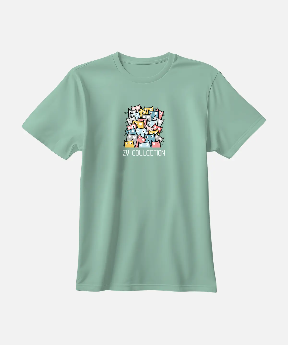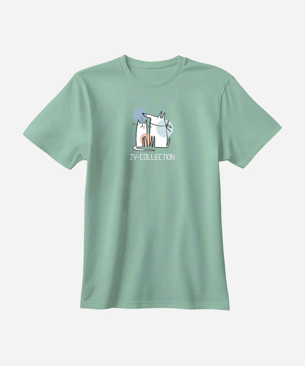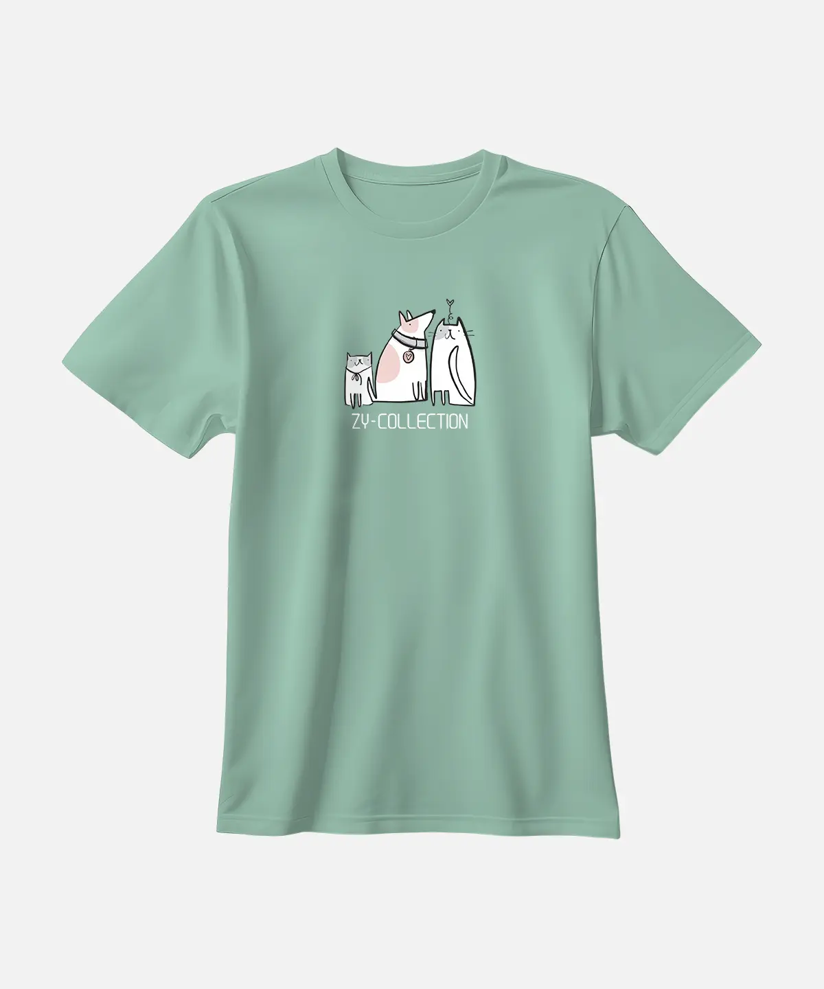 تیشرت سبز آبی نخ پنبه طرح سگ و گربه