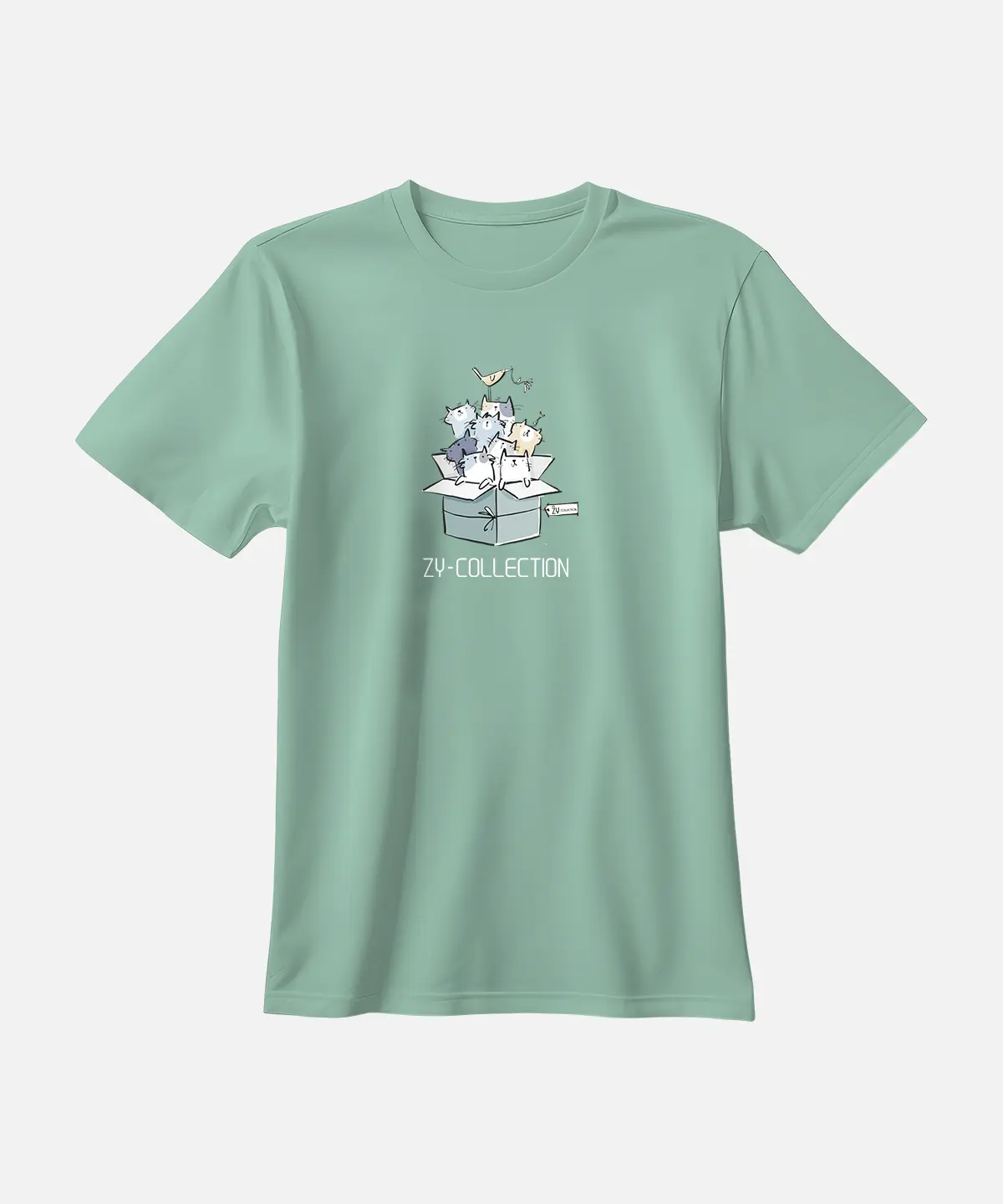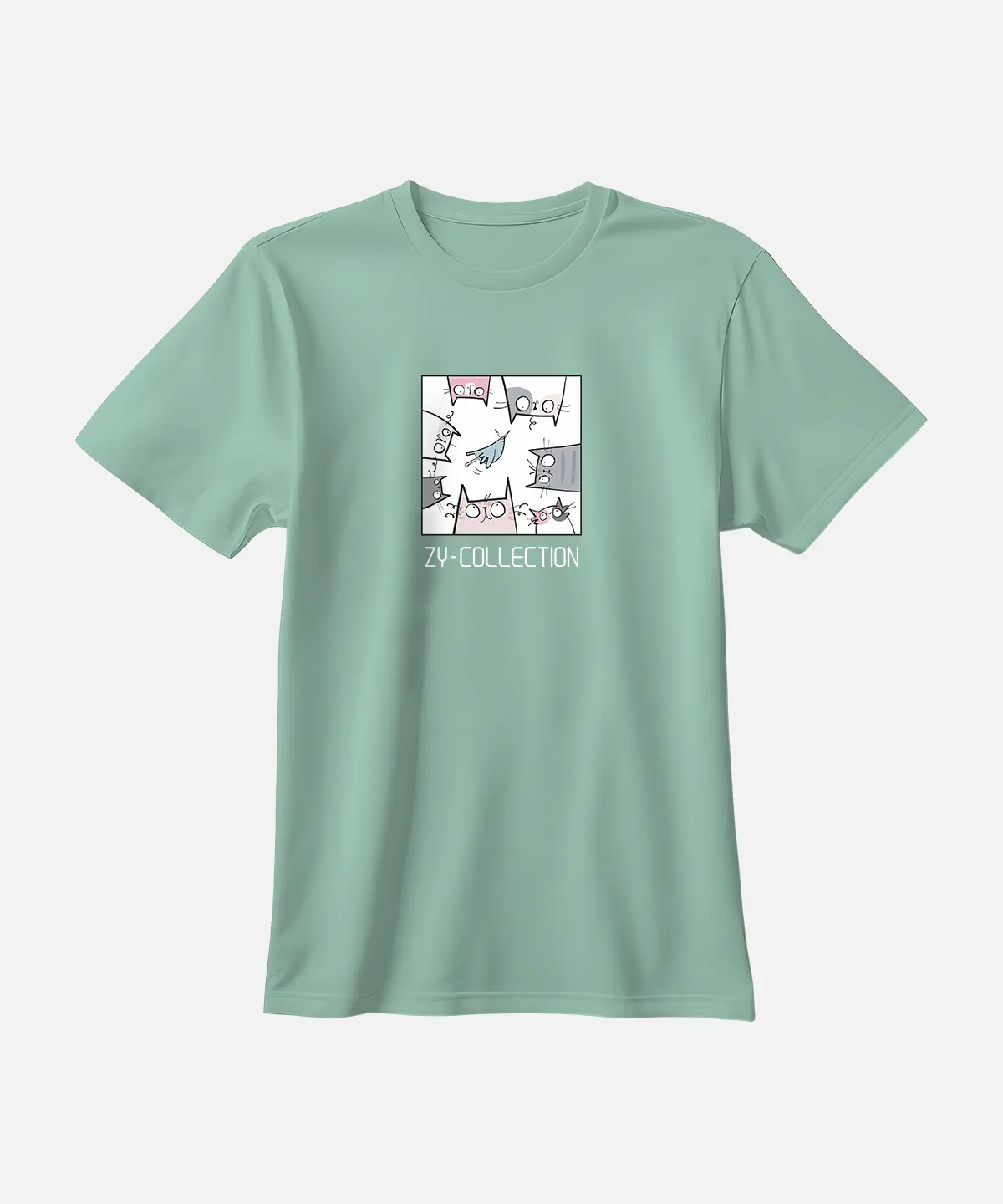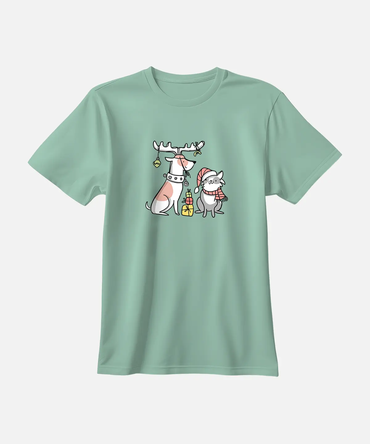 تیشرت سبز آبی نخ پنبه طرح سگ و گربه